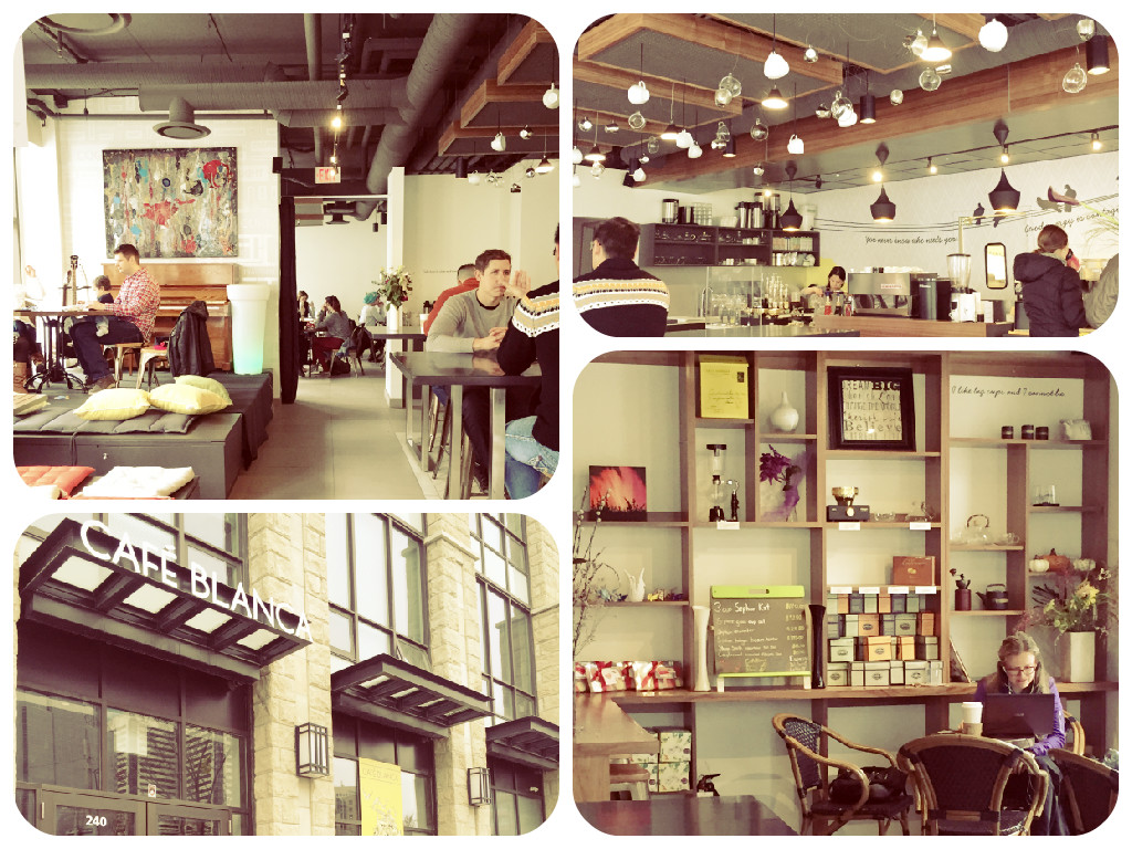 So when a new coffee shop comes along, I am ecstatic that more seats and sips can be had around town. Café Blanca is one of the newer coffee houses in Calgary having opened in late 2014. Located at the bottom of one of the residential towers in Eau Claire, Café Blanca is a refreshing and modern take on the coffee shop. A lot of what I enjoy about a restaurant or coffee shop is the ambience – the decor, the seating, the people. This place has it in spades. There’s plenty of seating from regular tables to high-tops to counter space. There’s also a raised area where families can sit on cozy pillows and it also becomes a stage for entertainment and live shows in the evening. There’s even more room in the back with more tables for private events or just to get your own space away from the main room.