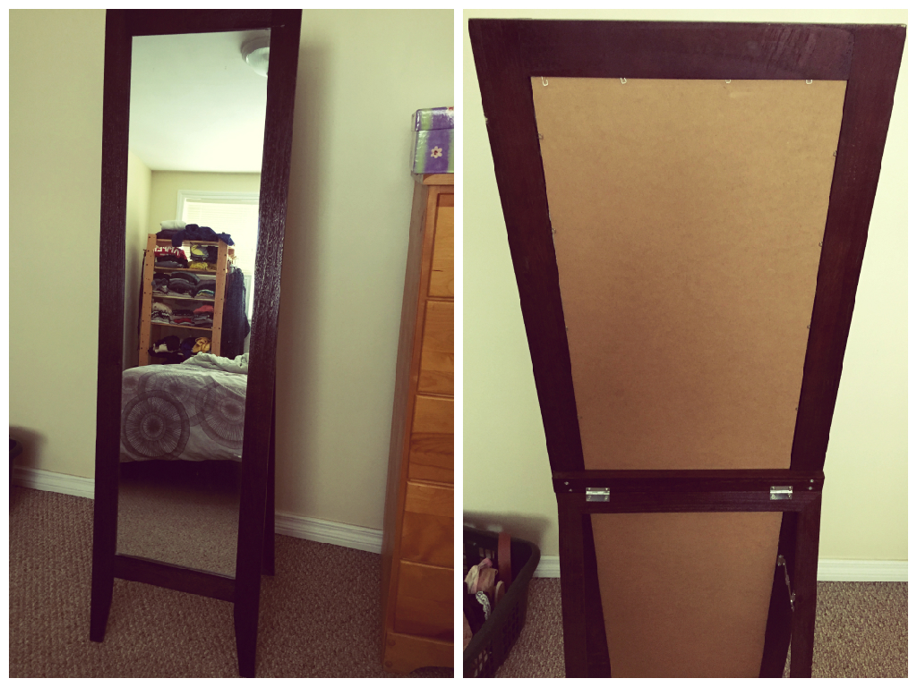 The mirror I have was a bargain find at Zellers back in the day. It stands up well enough, but isn’t particularly strong or super sturdy. With the short tilt in the supporting legs, I figured the clothing rail was probably a no-go, but adding hooks was definitely doable.